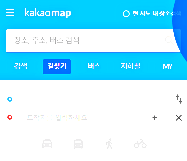 길찾기는 먼저 도보, 버스, 자동차, 자전거를 이용하여 도착지까지 시간을 확인할 수 있습니다. 만약 대중교통이나 도보로의 이동이 어렵다면 해단 길찾기는 표시되지 않습니다.